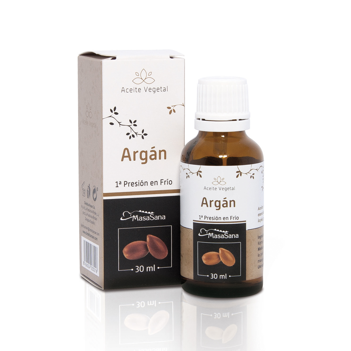 Aceite vegetal de argán MasaSana. Bote de cristal de 30ml con cuentagotas incorporado. 1º presión en frío